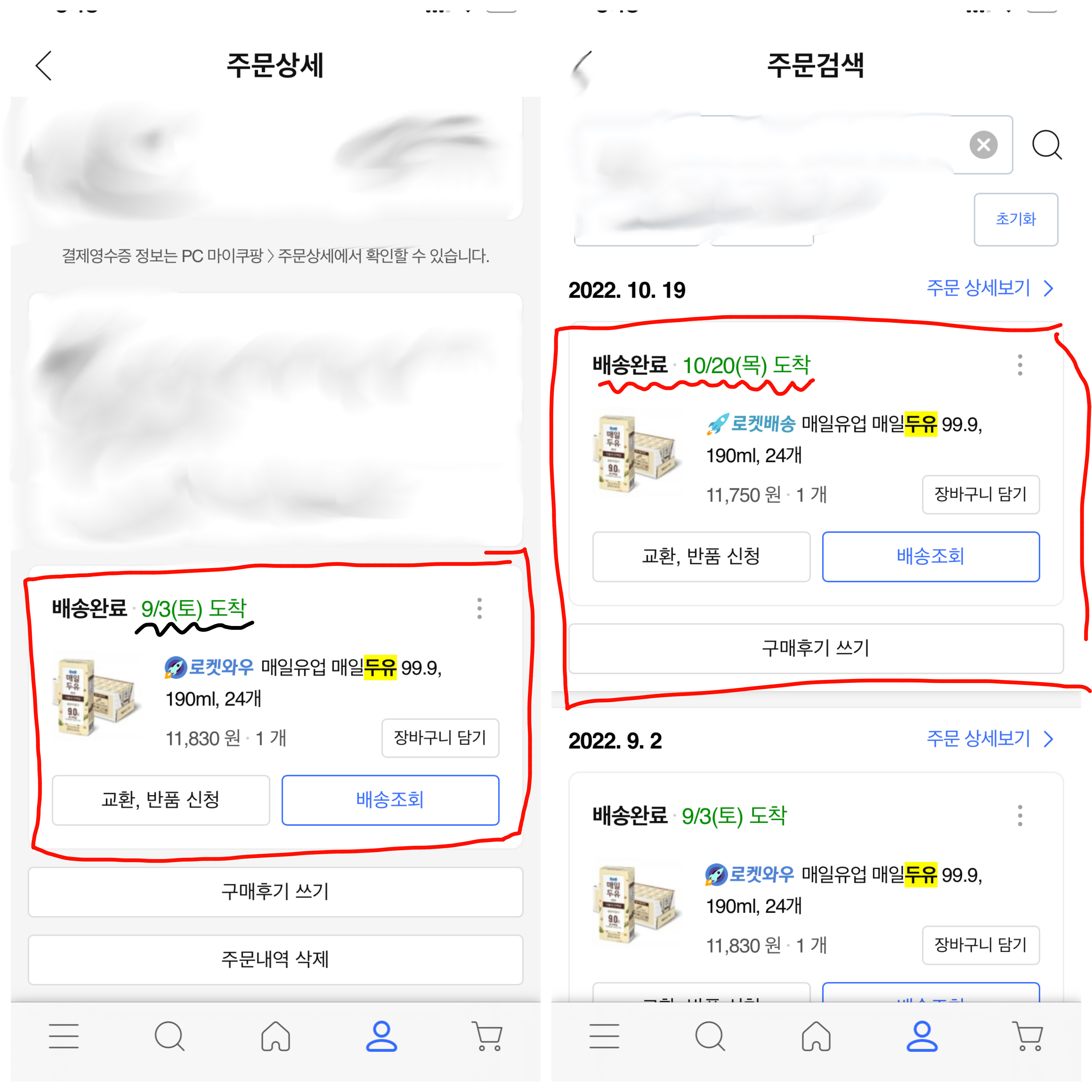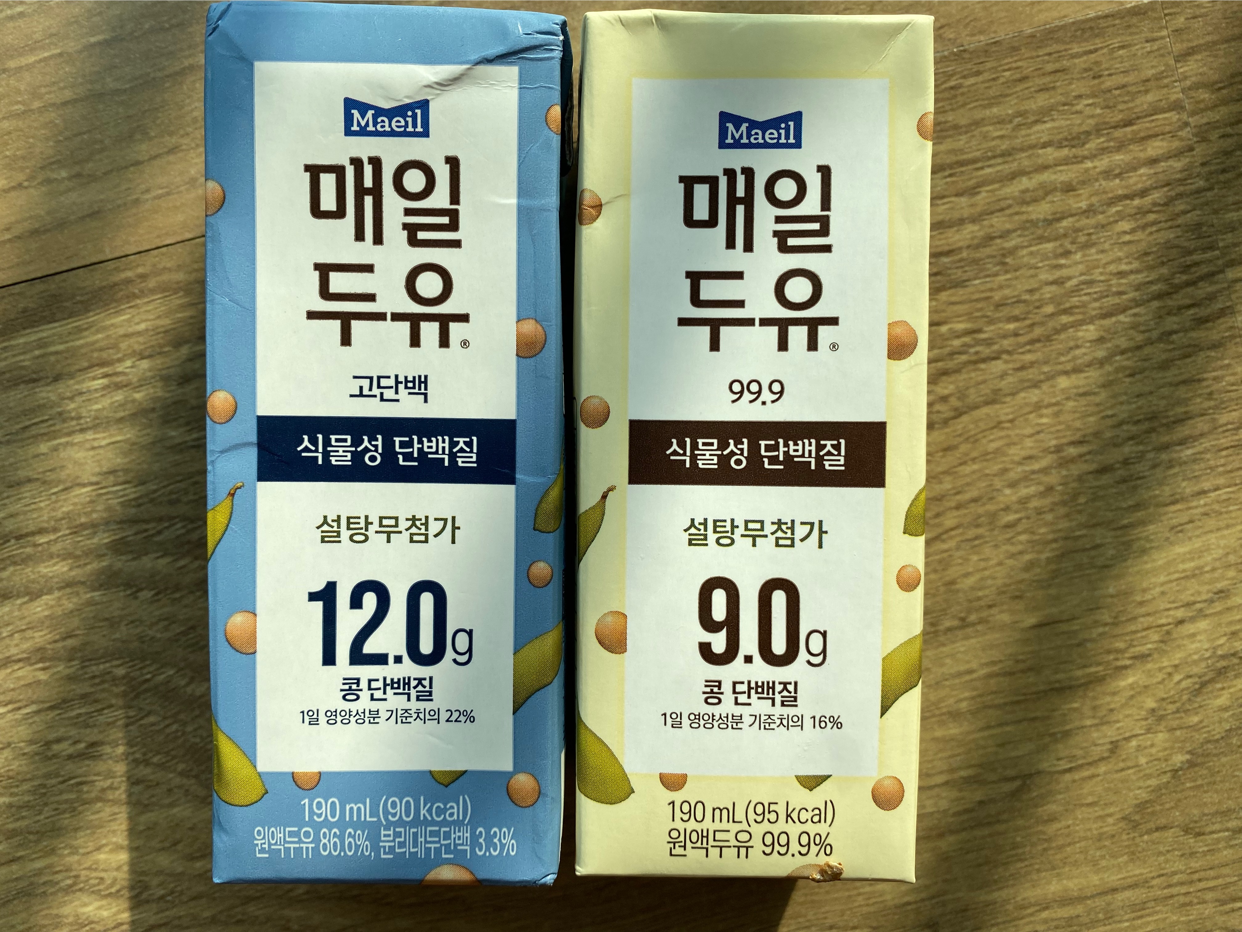 매일 고단백 두유(파란색)은 좀 더 고소하고 조금 더 무거운 목 넘김으로